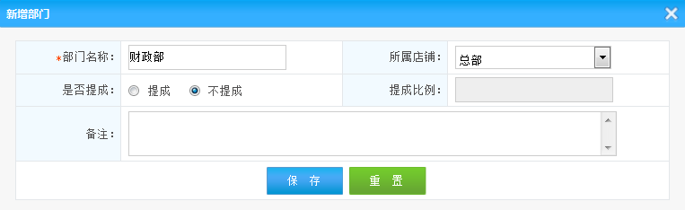 查看員工部門列表: 1.新增部門:添加新的部門 (見下圖) 2.查詢:可以根據(jù)店鋪的名稱 查詢該店鋪內(nèi)的一些部門(默認(rèn)查詢的是當(dāng)前店鋪的子部門) 3.部門列表:在列表中的操作一欄 可以對該部門進(jìn)行編輯或者是刪除