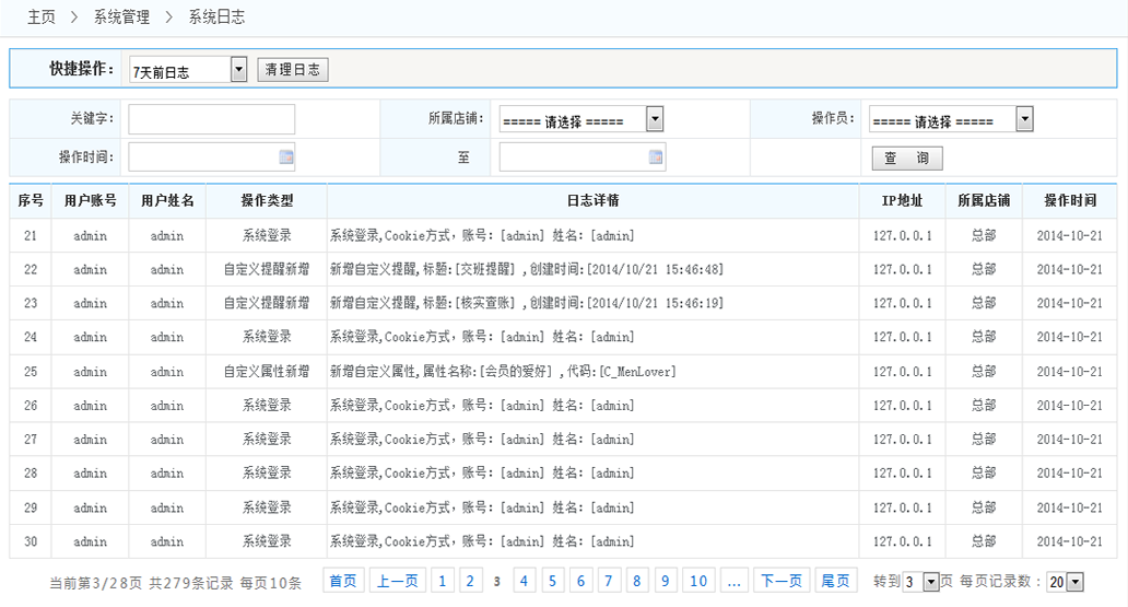 系統(tǒng)日志: 1.清理日志:清理日志 可以清除三個月以前的 一個月以前的 一周以前的 2.查詢?nèi)罩荆焊鶕?jù)條件查詢數(shù)據(jù)(關(guān)鍵詞、時間段、按店鋪、按操作員)