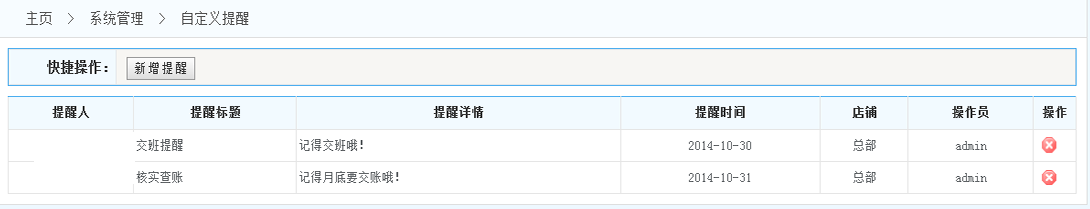2.提醒列表:在提醒列表的操作一欄 可以對(duì)自定義的提醒進(jìn)行刪除操作