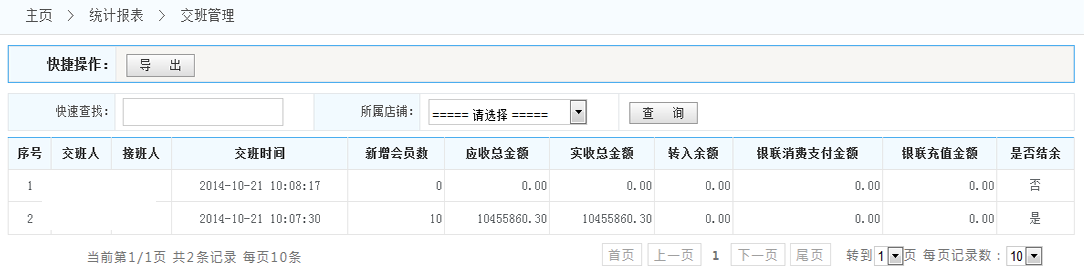 交班管理統(tǒng)計: 1.導(dǎo)出:將按條件查詢到的數(shù)據(jù) 導(dǎo)出成Excel表格 2.查詢:按照條件查詢出數(shù)據(jù)(例如 根據(jù)會員的店鋪會員的等級等)