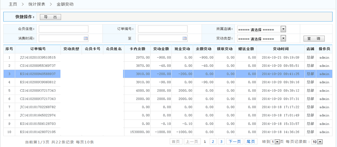 交班管理統(tǒng)計(jì): 1.導(dǎo)出:將按條件查詢(xún)到的數(shù)據(jù) 導(dǎo)出成Excel表格 2.查詢(xún):按照條件查詢(xún)出數(shù)據(jù)(例如 根據(jù)會(huì)員的店鋪會(huì)員的等級(jí)等)
