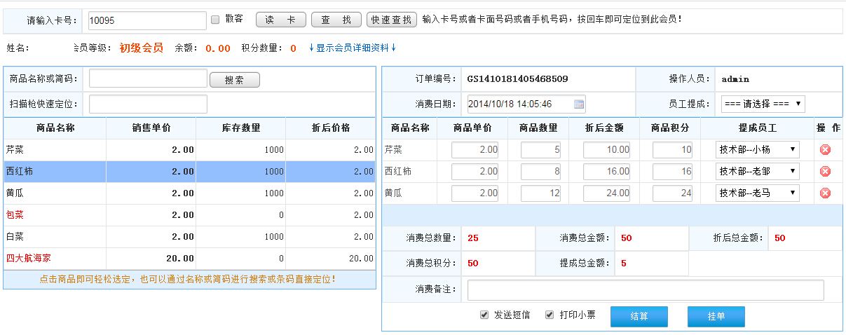 先會(huì)員刷卡,然后輸入商品的名稱或簡碼或者掃描槍快速定位查找商品;或者直接點(diǎn)擊商品選擇;選擇商品后點(diǎn)擊結(jié)算此訂單如圖顯示: