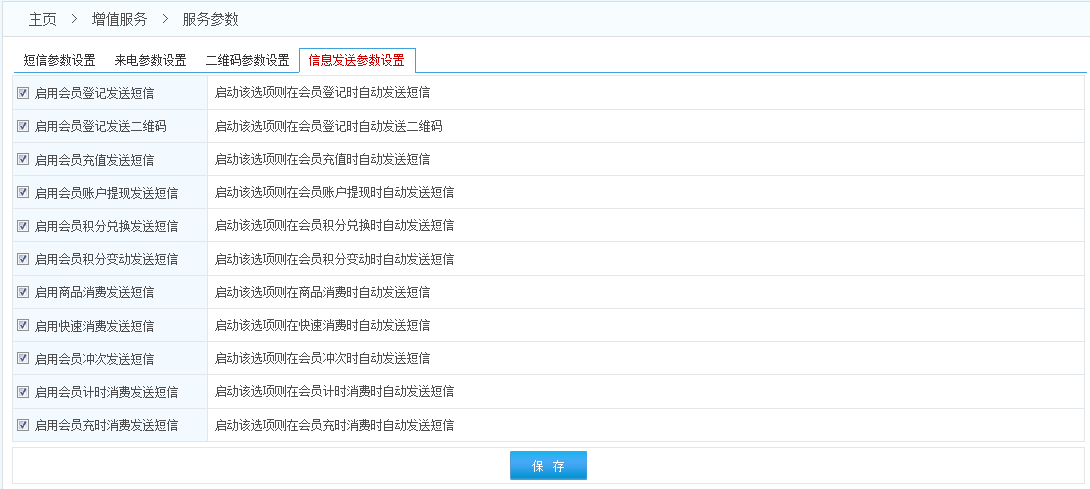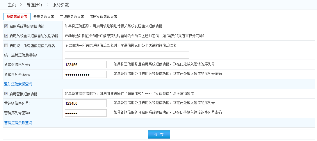 注意: 1.每一個參數(shù)對應著系統(tǒng)的一個功能,請務必閱讀完每條參數(shù)后面的說明文字后 再開啟或關閉該功能。 2.通知短信是會員在本系統(tǒng)中進行消費充值等操作時給會員發(fā)的提醒短信;營銷短信是為了促銷等目的專門為一個或多個會員發(fā)送的(營銷短信有且只能在發(fā)送短信的頁面發(fā)送)