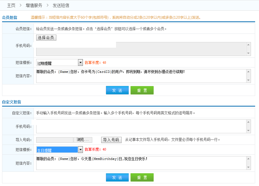 會員短信:給會員發(fā)送一條或者多條短信。點擊‘選擇會員’按鈕可以選擇一個或者多個會員。
