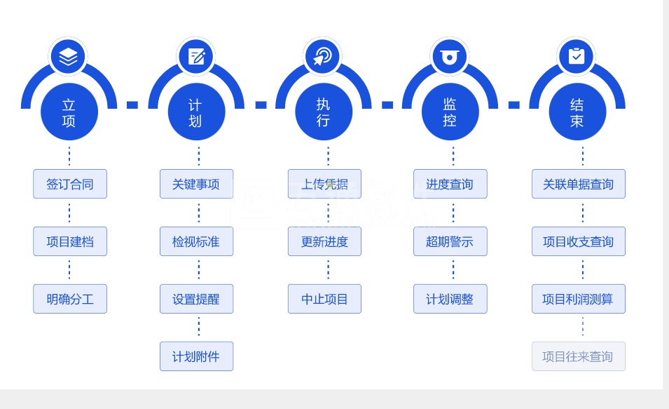系統(tǒng)中支持查詢:項目進(jìn)度(含關(guān)聯(lián)單據(jù))、項目資金收支情況、項目利潤測算情況、項目損益表(財)。